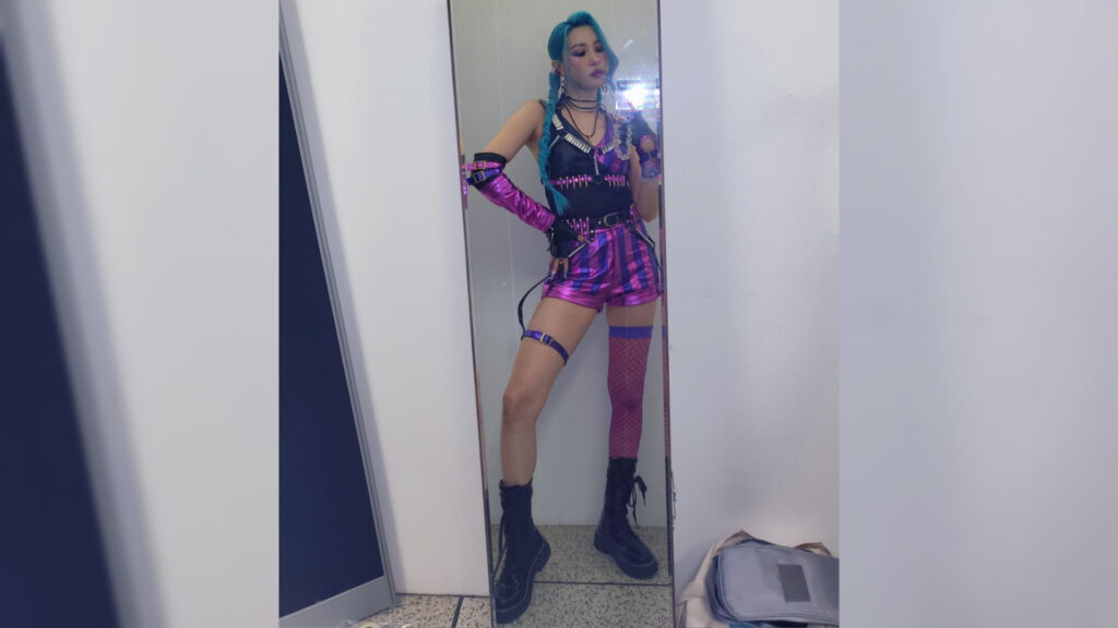 SUNMI’s Jinx cosplay follows the champion’s default look in the game, complete with striped top, shorts, and fishnet stockings. She dyed her hair bright blue a few weeks before the performance, and used hair extensions to match Jinx’s long, braided twin tails.