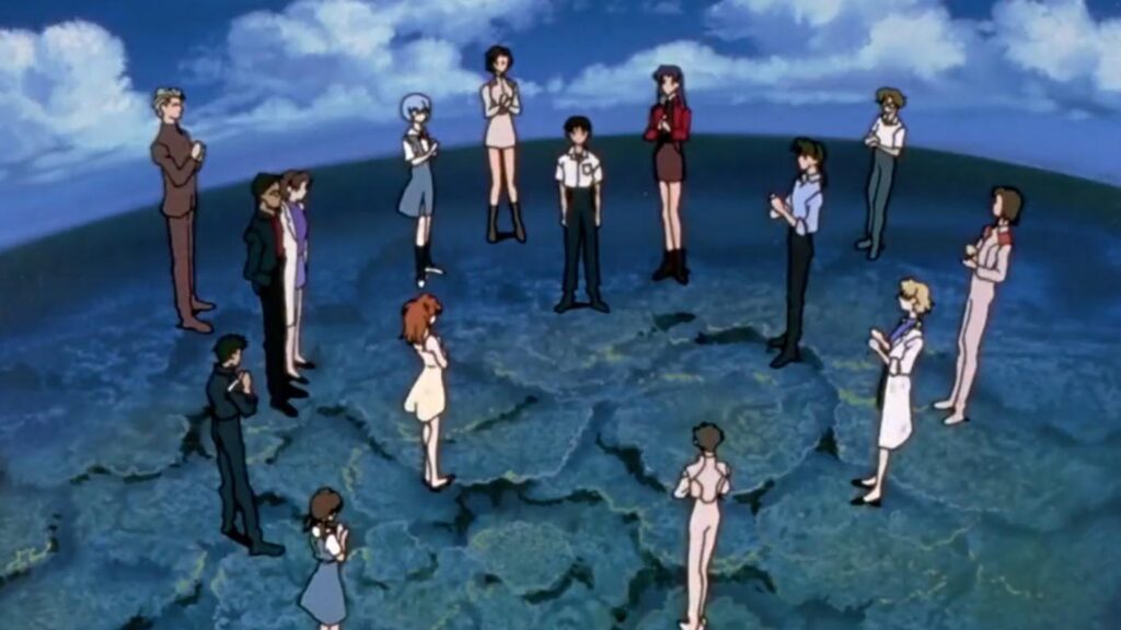 Despite the doom and gloom of Evangelion’s apocalyptic setting, the show ends on a sentimental note. The supporting characters appear out of nowhere to congratulate protagonist Shinji Ikari and ultimately, the fans, for their support of the show.