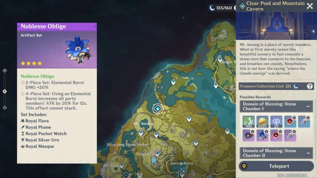 You can farm Noblesse Oblige at the Clear Pool and Mountain Cavern domain, northeast of Mt. Aocang, and Archaic Petra at the Domain of Guyun in Guyun Stone Forest.