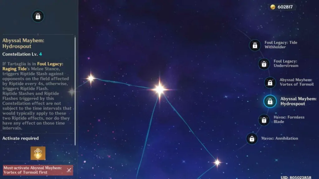 The team composition gets incredibly strong if Childe has his fourth constellation, Hydrospout. Hydrospout automatically triggers Riptide every 4 seconds on marked opponents, which could create an automatic Bloom combo loop as seen in this tweet.