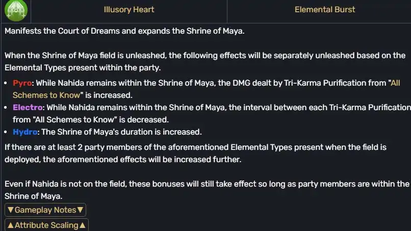 You can also activate Nahida’s burst Illusory Heart as it buffs the Archon’s talents based on the elemental types in your party. Since Hydro and Electro are present, it increases the Shrine of Maya’s duration and decreases the interval between Seed of Skandha’s Dendro attacks respectively.