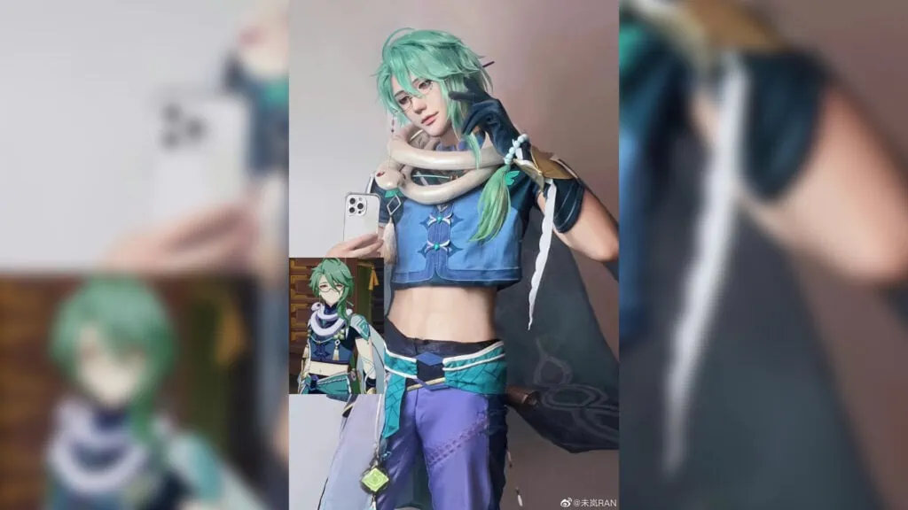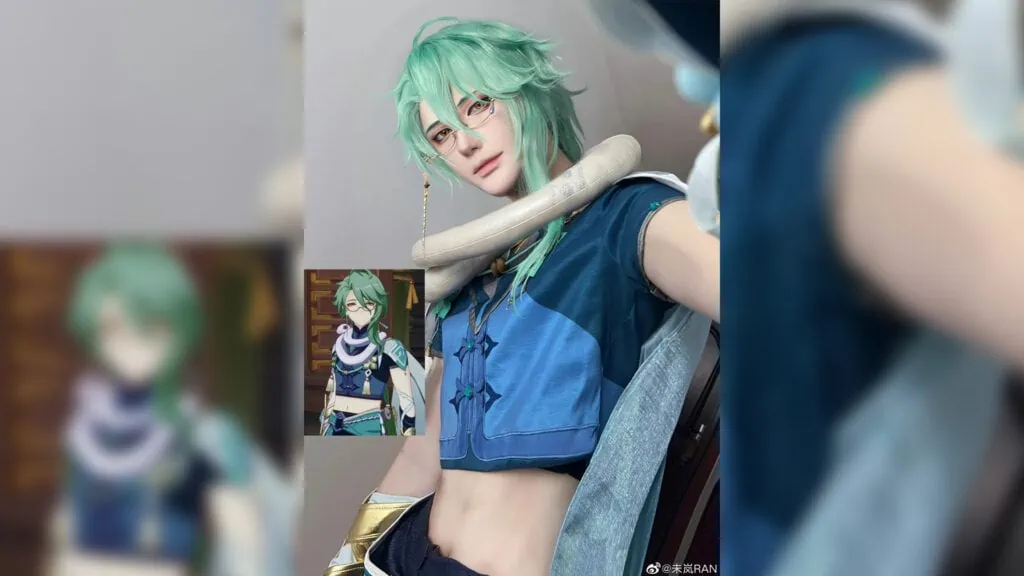 Their cosplay showcased the charm of the 5-star Dendro character in their blue crop top and purple pants. Wrapped around their neck is a white snake prop to portray Changsheng, the character’s pet snake.