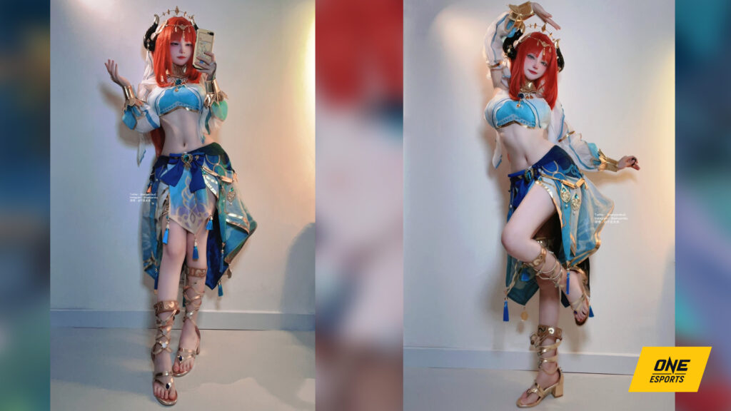 The cosplayer nailed down Nilou’s look from head to toe, wearing a headpiece with a pair of black horns and golden embellishments.
