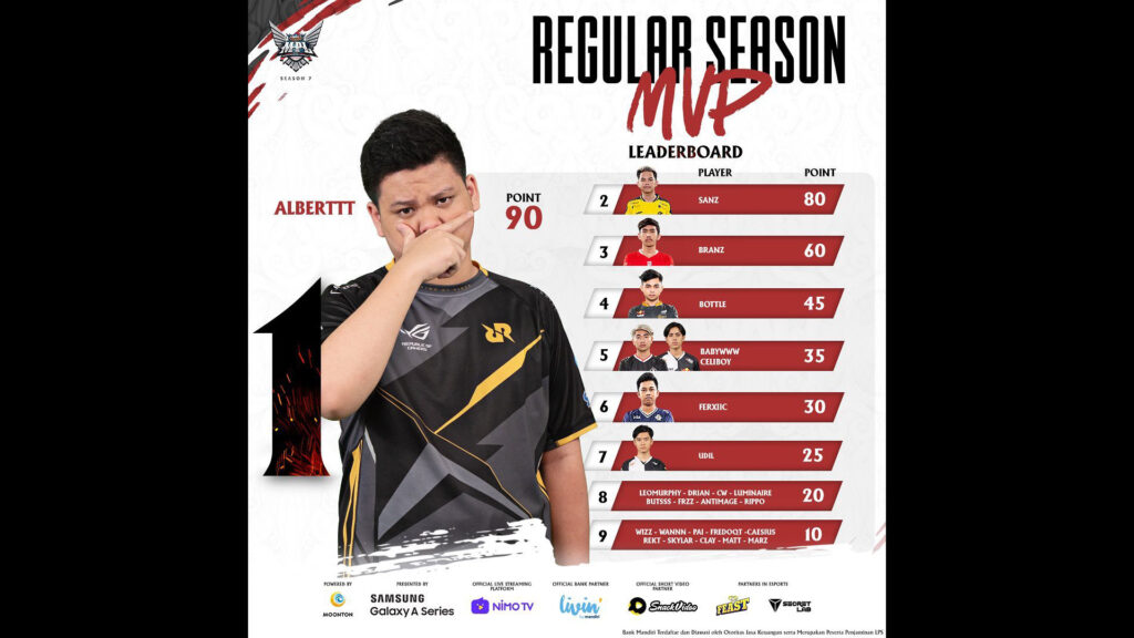With Season 7 of MPL Indonesia moving into the playoffs, the league has officially named RRQ Hoshi’s Alberttt the MVP of the regular season.