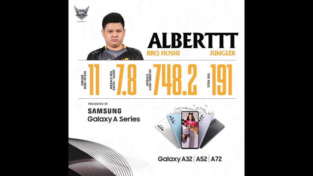 By the end of the season, Alberttt was a stats-heavy superstar for RRQ. He used 11 heroes with an average of 7.8 KDA and 748.2 gold per minute and stands as the player with the most kills throughout the regular season (191 kills).