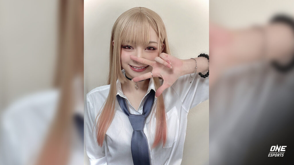 She portrayed Marin’s high school getup in a complete uniform, choker, and the character’s iconic blonde hair with pink gradient tips.