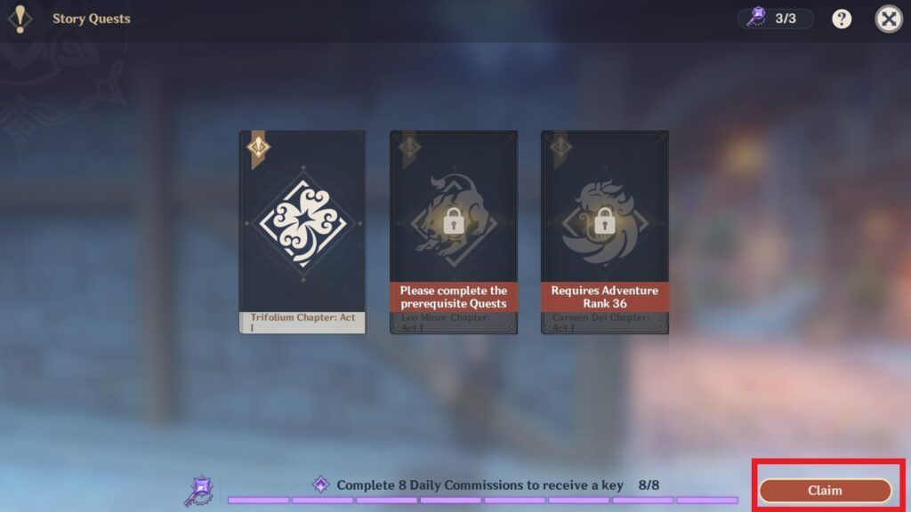 If you’d like to check out Klee’s gameplay, you can do so by acquiring the AR32+ story quest titled “Who is Mondstadt’s Strongest Fighter?”. To unlock it, you can go into the quest tab and click on Story Quests at the bottom right and Klee’s story quest should be the first option (Trifolium Chapter: Act 1), costing you one story quest key. You can earn story quest keys by doing eight daily commissions and claiming it in the story quest tab.