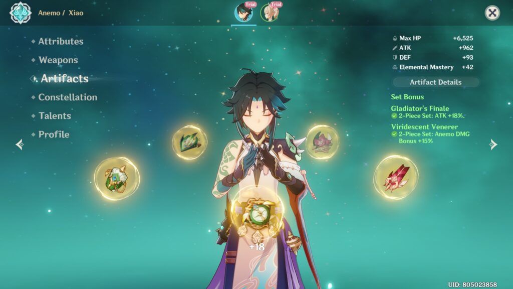 Xiao’s go-to artifact set is 4-piece Vermillion Hereafter, obtained from the Lost Valley domain in Liyue’s Chasm.