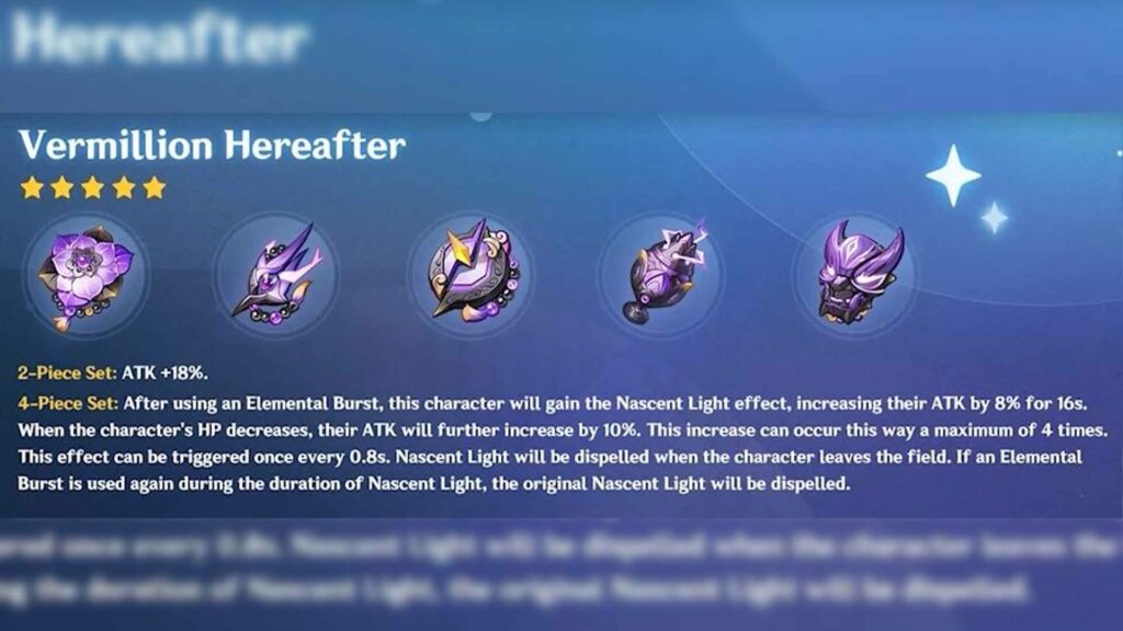 In addition to a solid 18%+ Attack bonus at 2-pieces, the 4-piece set works perfectly with his burst. The 4-piece bonus introduces the Nascent Light effect, which further grants an additional 8% Attack for 16 seconds.