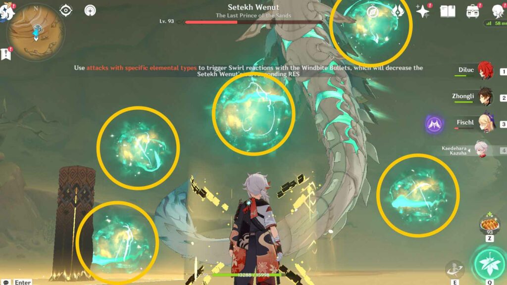 Setekh’s biggest move is the Windbite Bullets. In this sequence, the giant serpent floats in the air and summons five Anemo orbs that surround him.