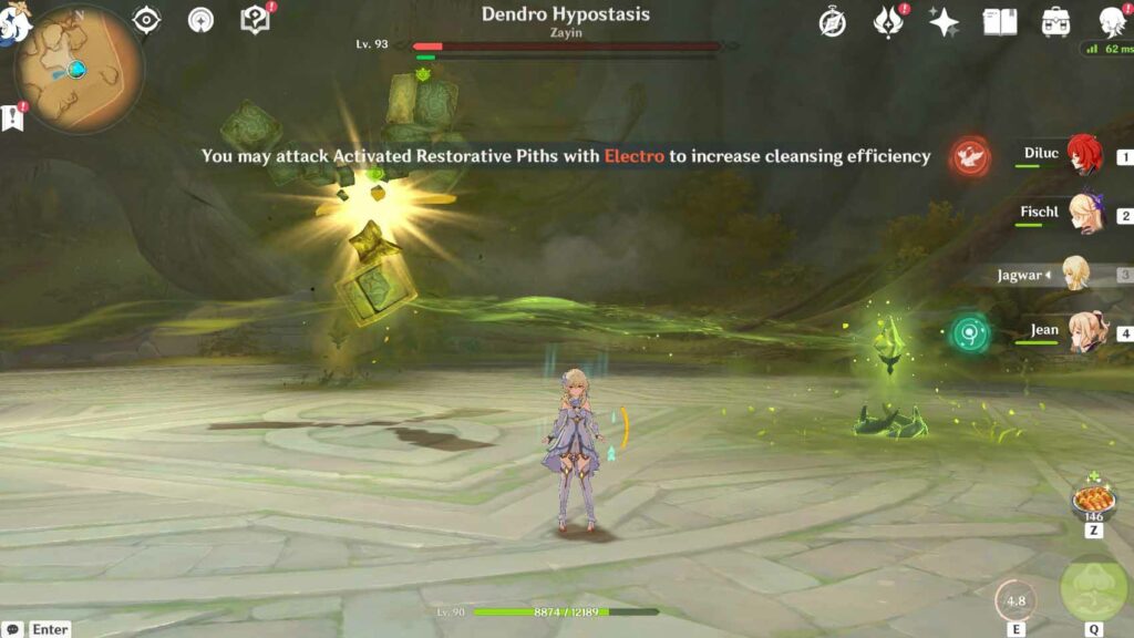 You must activate these Piths using Dendro skills, for they commence the boss’ cleansing process, indicated by a green bar under its health. You can speed up the process by applying Electro to the activated Piths.