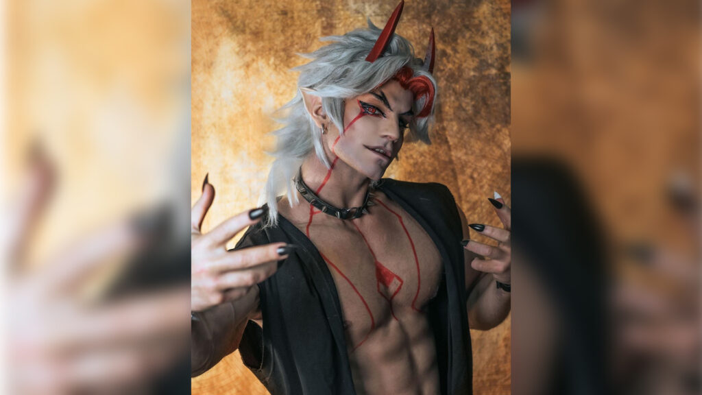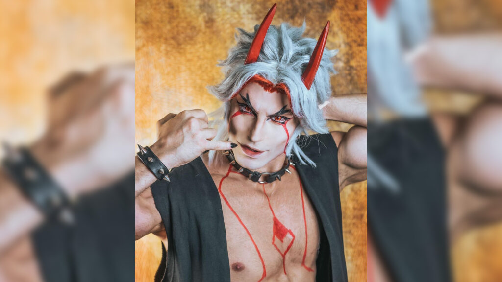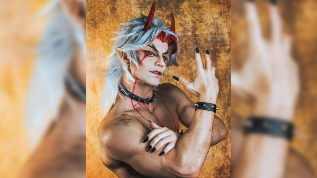 The cosplayer also added accessories, like spiked bracelets and chokers, and the character’s pair of red horns to complete his initial Arataki Itto cosplay.