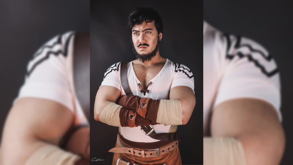 Prince flawlessly captures the blacksmith’s serious expression and firm stance in his cosplay photos. His Wagner costume is complete with the NPC’s leather gloves, working apron, and deep V-neck white top.